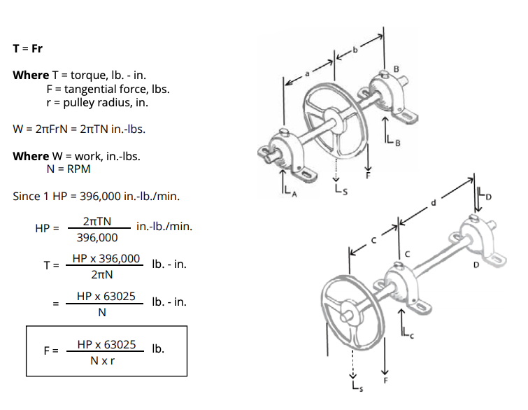 The formula below provides useful information for determining tangential force (F) when horsepower is given. The bearing example below uses a Mounted Pillow Block.