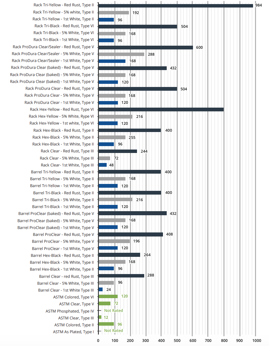 The bar graph shows the salt spray hour results to first white corrosion, 5% white, and hours to red rust for all standard plating types along with variations of these coatings. All platings tested were in the thickness classes of SC 2 and SC 1. Hours to white rust will not vary between different coating thicknesses of the same type of plating assuming another process has not been done. As seen on the chart there are some proprietary coatings that show hours with a sealer or after being baked. These hours are of a higher capability than as minimum stated in ASTM B633. All hours are as shown from testing by platers on their plating's capabilities.