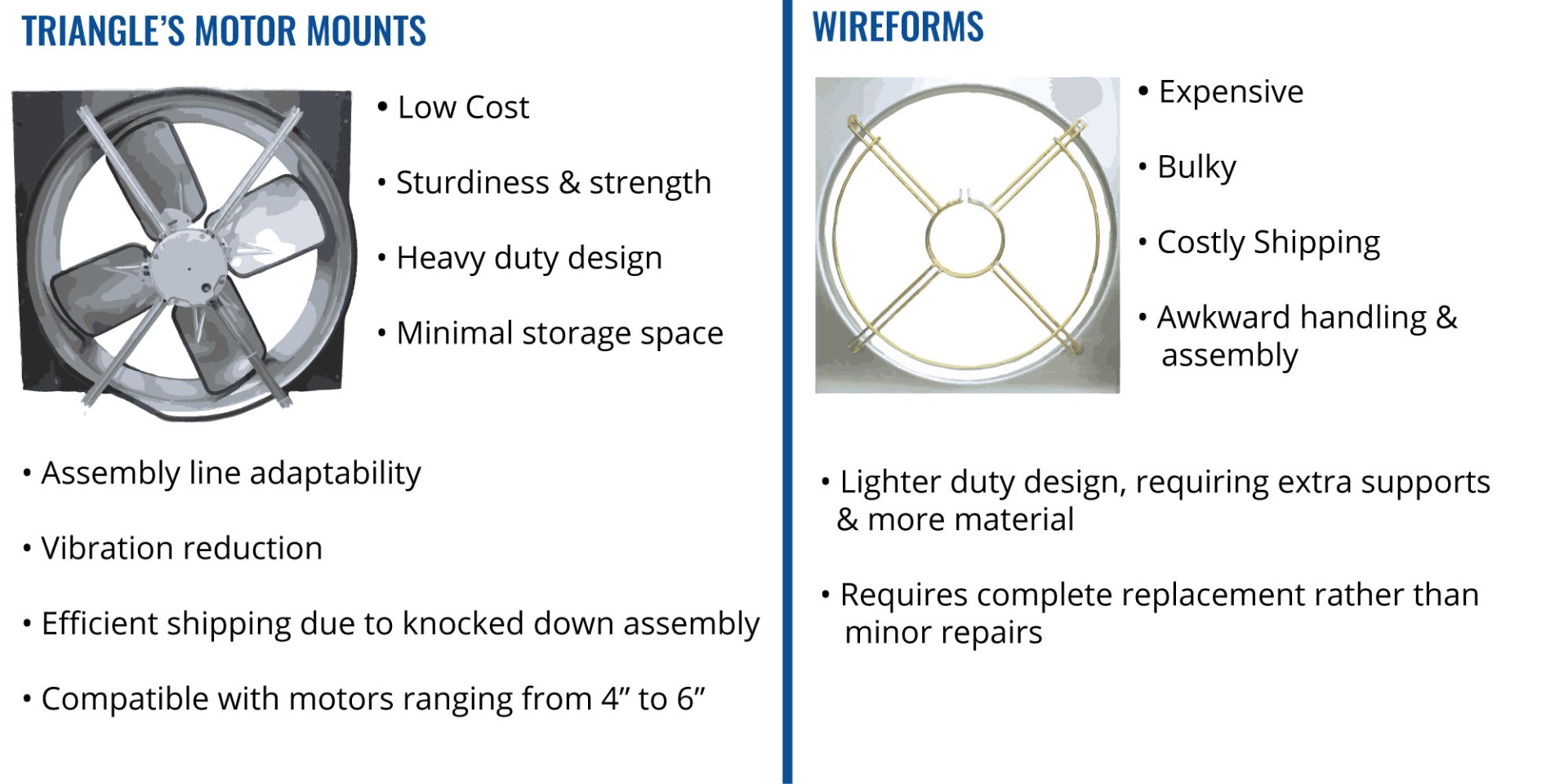 Triangle Manufacturing's belly band motor mount brackets are used in residential furnaces and commercial air handlers. Below you will see the benefits of switching from a wirefrom to one of Triangle's motor mount assemblies.