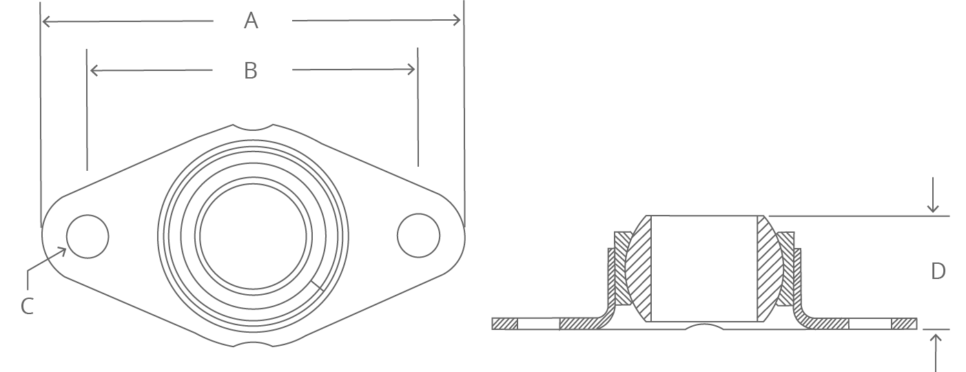 | Shaft Size | Oil | Grease Zerk | Ball Material | A | B | C | D | Mount Hole Shape | Static Load Capacity (lbf.) |