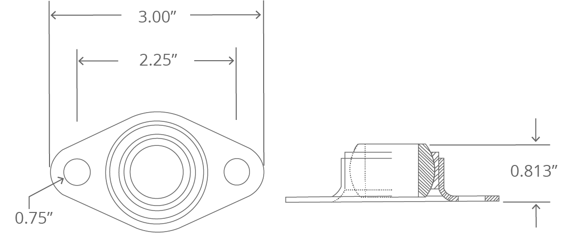 Triangle's extra strength 2 bolt flange bearings are stamped from 14-gauge galvanized steel with a static load capacity of 1,600 lbf. They can be manufactured with a sintered bronze, sintered iron or plastic spherical plain bearing.