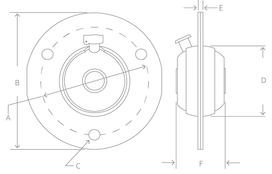 | Oil Cup | Grease Fitting | Shaft Size | A | B | C | D | E | F | Mount Hole Shape |